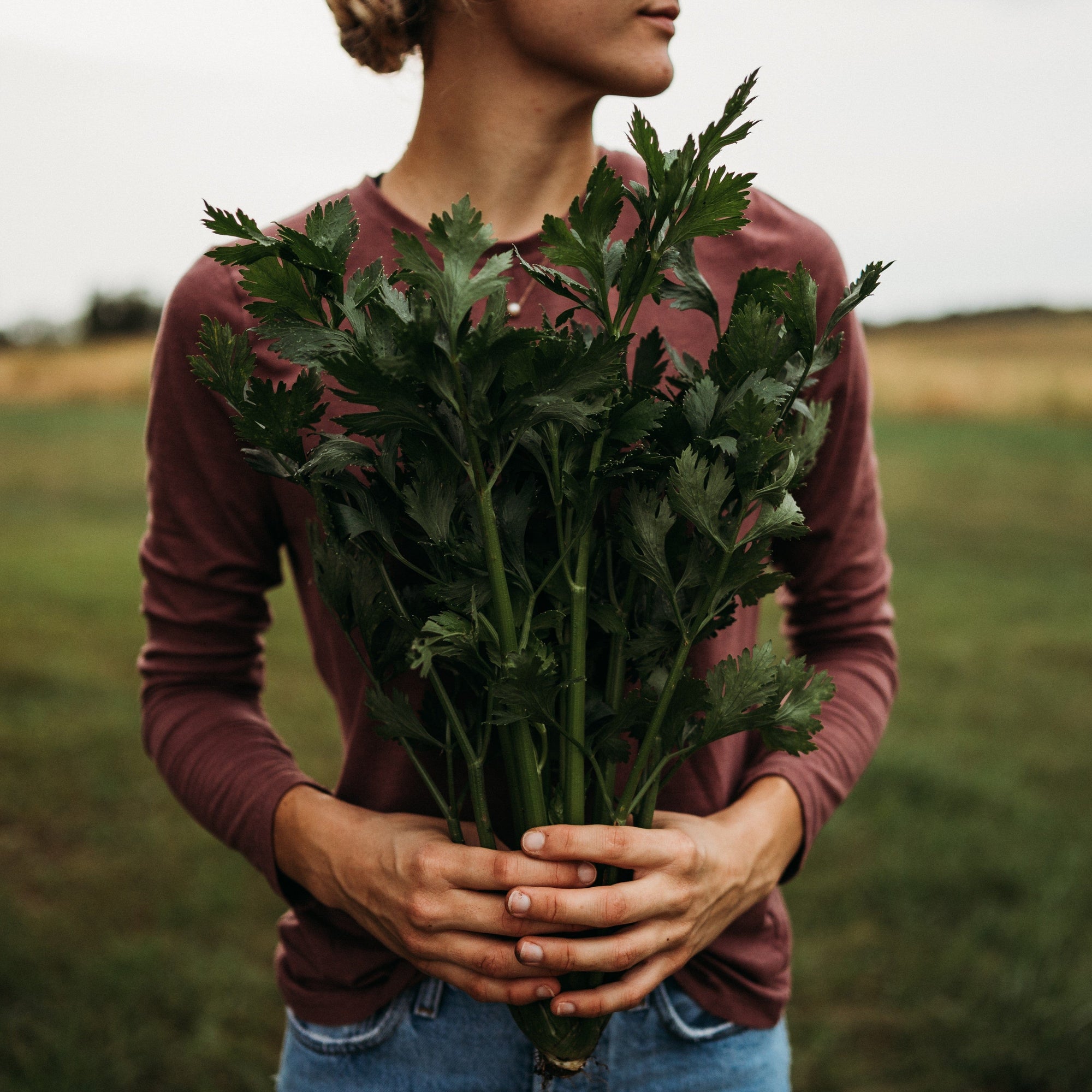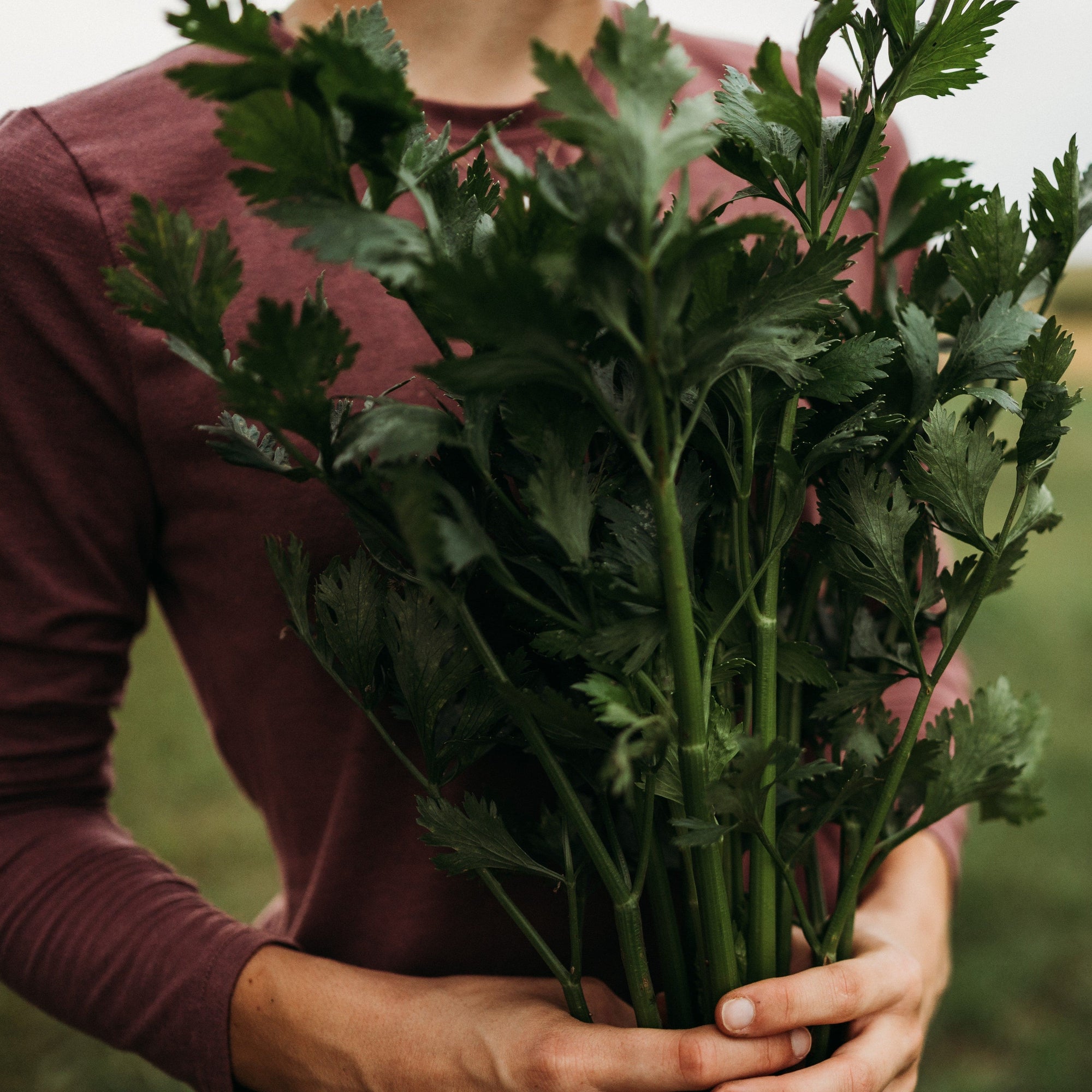 Tendercrisp is an open-pollinated variety of celery that produces smooth, tender stalks and lush dark green leaves.  First introduced in 1969 by the Ferry-Morse Seed Company, Tendercrisp was noted at the time for its long petiole length, which was often found lacking in Pascal-type celery varieties.  It was also claimed to be more resistant to boron and magnesium deficiencies and to possess some tolerance to western celery mosaic virus.  In our trials, Tendercrisp produced large plants (about 2 feet) with really beautiful dark green leaves.  You didn't need the row stake to know when you'd reached the Tendercrisp.  Its leaves were so much darker than the other varieties we trialed.  Unfortunately, our pictures were taken near sunset just as a storm was rolling in, so the stalks and leaves appear lighter in color than they actually were.  You'll just have to take our word that they were beautiful, lush, and dark green in color— or you could try them yourself!  Tendercrisp celery matures approximately 100-110 days after transplant.  Each packet contains a minimum of 250 seeds.